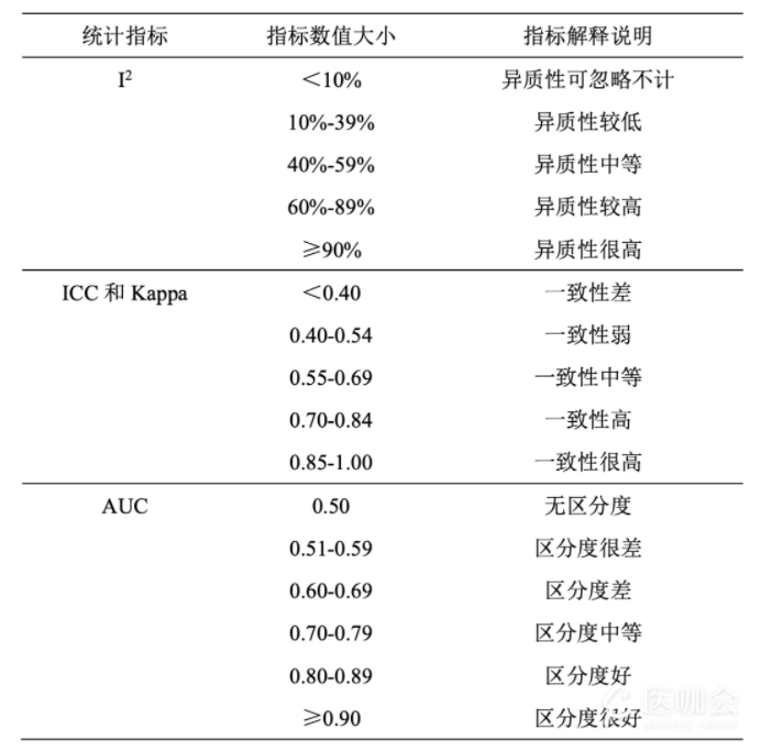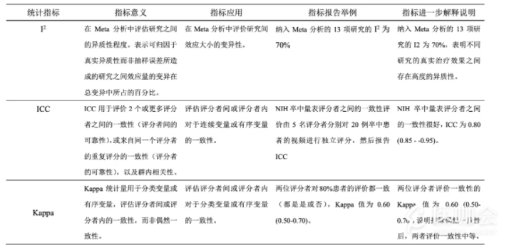 研究之间效应大小的真实变化称为异质性。通常报告I2统计量来量化这种异质性。如评分量表的评分者间或评分者内的信度,通常采用组内相关系数(ICC)进行评价。