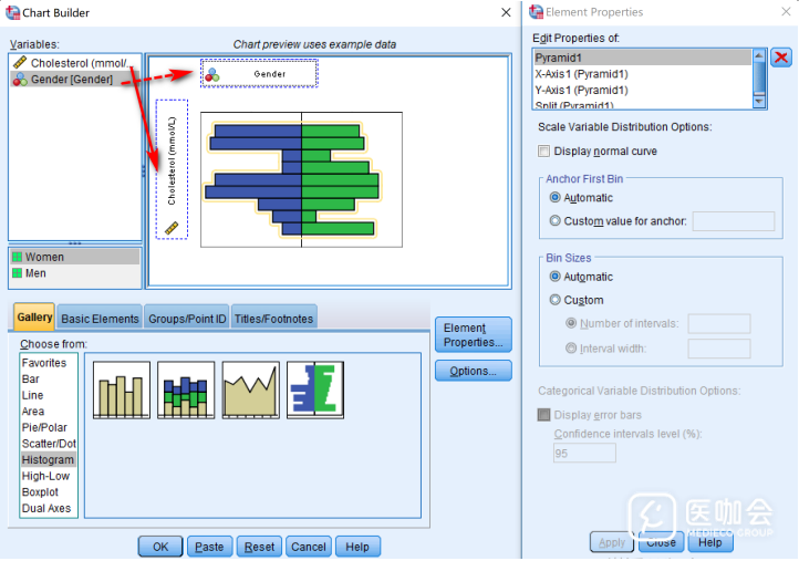 研究者想绘图展示男性和女性中总胆固醇水平分布特征的差异,可以使用人口金字塔图。人口金字塔图常用来展示有序或无序分类变量的其中两个分类下,连续变量或有序分类变量的分布情况,常用来结合Mann-Whiteney U检验使用。