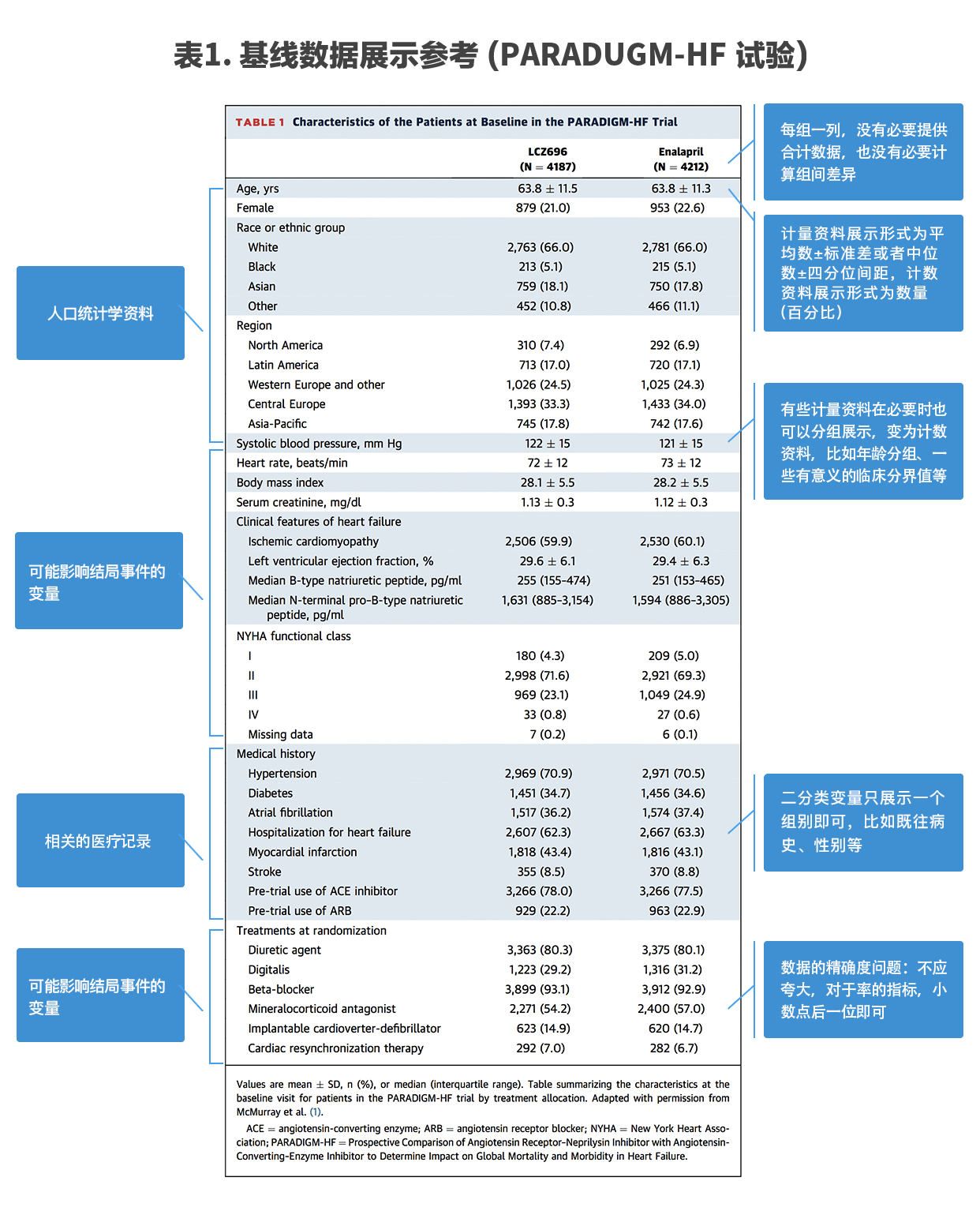 试验成果的展示,至少应该包括3个部分的内容:基线(Baseline)数据、结局数据及试验信息(Trial profile)。而在结果数据部分,你的数据很有可能包含3种类型,即二分类频数资料、计量资料以及时间-事件数据。