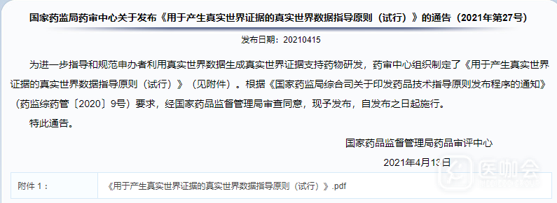 2021年4月15日,国家药品监督管理局药品审评中心官网发布了《用于产生真实世界证据的真实世界数据指导原则(试行)》。