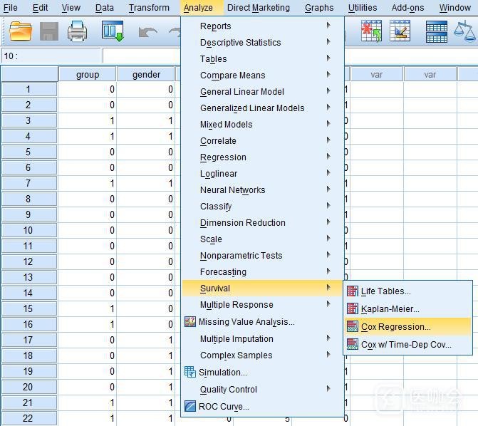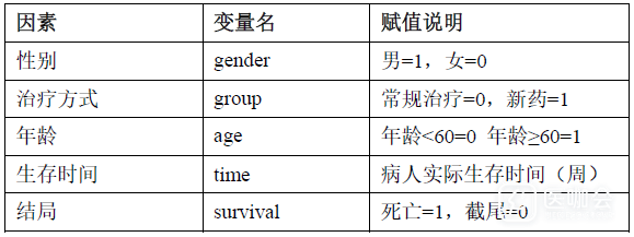 某研究者拟观察某新药的抗肿瘤效果,将70名肺癌患者随机分为两组,分别采用该新药和常规药物进行治疗,观察两组肺癌患者的生存情况,共随访2年。研究以死亡为结局,两种治疗方式为主要研究因素,同时考虑调整年龄和性别的影响,比较两种疗法对肺癌患者生存
