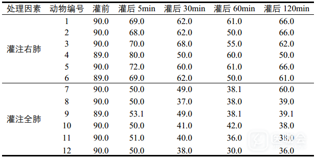 某研究者拟评估海水淹溺后残留于肺内的海水是否可导致严重的肺损伤,建立动物模型。将12只杂种犬随机分为两组,一组海水灌注右肺,另一组海水灌注全肺,每组6只。每只犬分别于海水灌注前以及灌注后5min、30min、60min、120min检测氧分