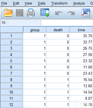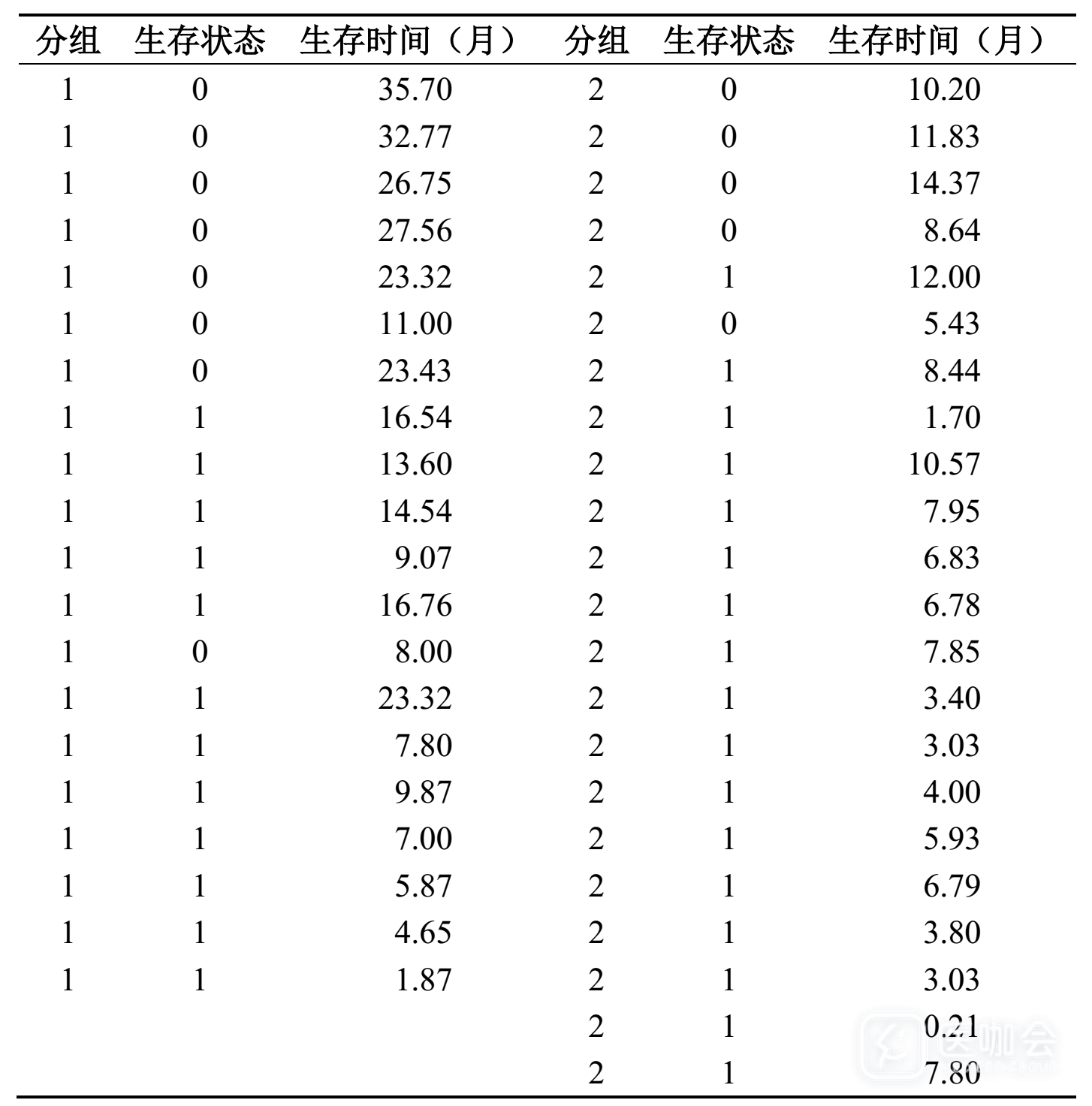 某肿瘤医院医生收集了甲、乙两种手术方法治疗42名肺癌患者的随访资料,数据包括患者的治疗分组、生存状态和生存时间(月)。数据见表1,其中分组1为甲种手术组(20人),分组2为乙种手术组(22人);生存状态0表示失访或存活,1表示死亡。请问两种