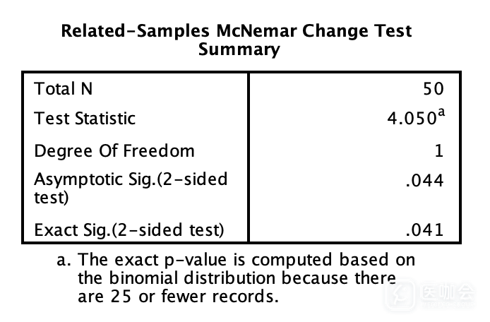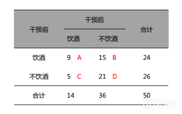 某研究者想要观察戒酒干预的效果,招募了50例研究对象,饮酒率从48%下降到28%,这个下降是否有统计学意义呢?McNemar's检验(配对卡方检验)可用于分析两个相关率的变化是否有统计学意义。
