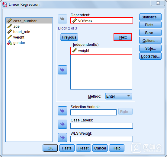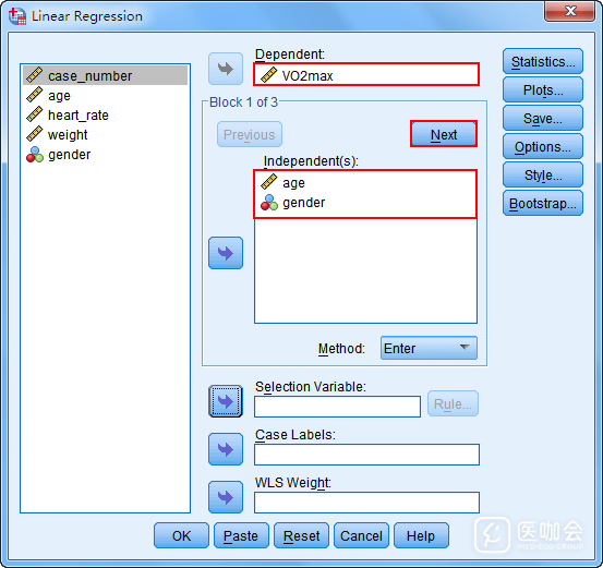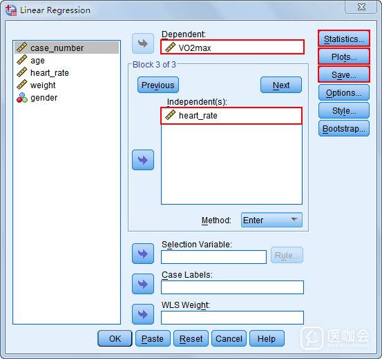 研究者已知某些自变量(age和gender)与因变量(VO2 max)有关,拟判断逐个增加自变量(weight和heart_rate)后对因变量预测模型的改变。针对这种情况,我们可以使用分层回归分析,但需要先满足8项假设。