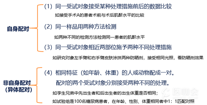 配对设计目的是控制非试验因素对结果的影响,具有两种常见的形式:自身配对和非自身配对(异体配对)。自身配对是同一受试对象的比较,而非自身配对是比较两个配对的受试对象。配对的受试对象具有相同的特征,例如年龄、体重、性别等。