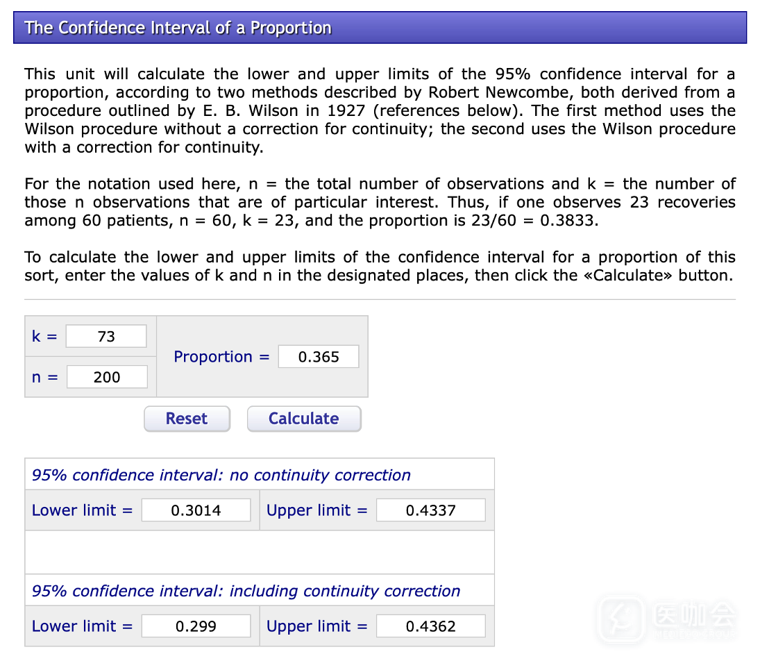 临床研究中,经常要计算某个样本的率(proportion),以及根据样本的率估算总体率的95%可信区间(Confidence Interval,CI)。样本率的计算很容易,那如何计算估算总体率的95%CI呢?对于此类二项分布的数据,如果“数