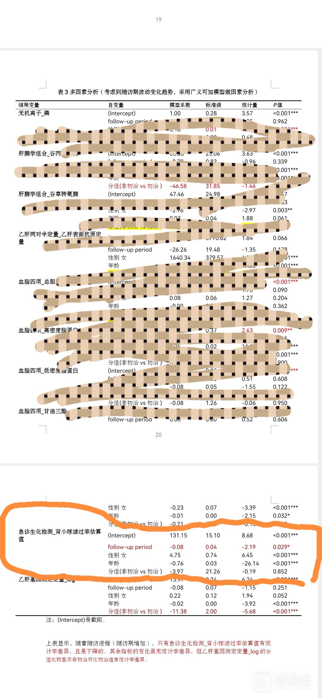 我在分析A药对乙肝的治疗和安全性。分为:GROUP1:A药初治组,GROUP2:转换为A药组。分析两组在0周、12周、24周各指标的变化差异。统计方法:随访期资料趋势变化采用混合线性模型,以随访期(follow-up period)、年龄、