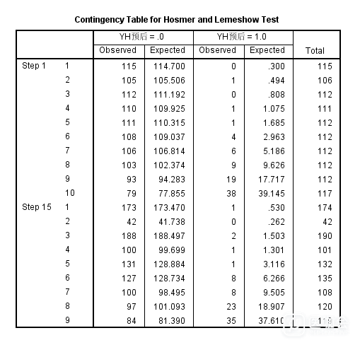 SPSS进行Logstic多因素回归分析,方法采用逐步回归法,如果要作校准图,数据是采用Step1的,还是采用最后一个Step的数据? PS:小咖曾在一篇文章中,提到校准图的数据是分10组的,所以我在想是不是采用Step1的数据,但是lo