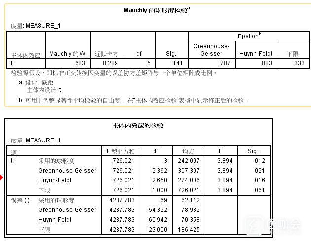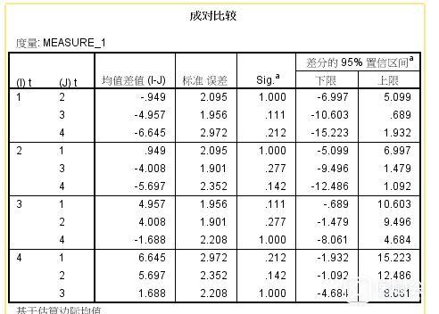 做四组数据的单因素重复测量方差分析,满足球形度假设,但一元方差分析(即主体内效应)为0.012.有显著差异,但是后面的成对比较任意两组没有显著差异。