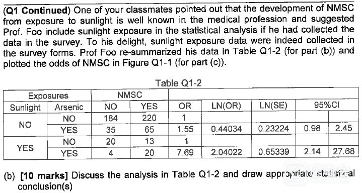 各位大神,小弟遇到一个应该是关于病例-对照研究的题目,关于题目中的(b)(c)两问好像是用到了stratification(分层)和ANCOVA(协方差分析)的知识,但是小弟还是不知道如何下手,尤其是里面带协变量的卡方表格、协方差与odds