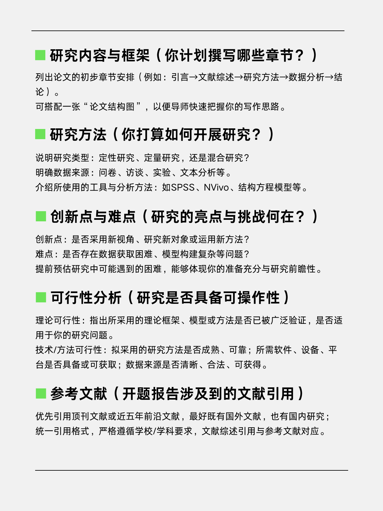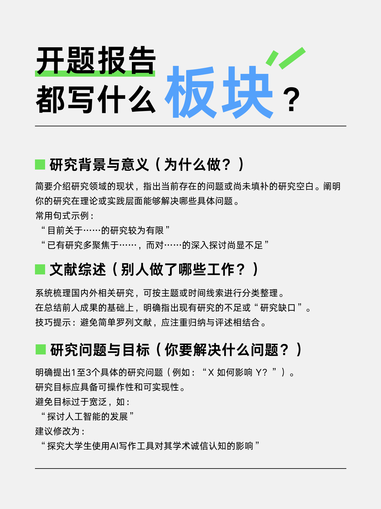 撰写开题报告并非“凑字数”,而是向导师展示你具备清晰的思路、独立研究的能力以及明确的方向感。一份合格的开题报告通常包含以下六个核心部分:1. 研究背景与意义(为什么做?)简要介绍研究领域的现状,指出当前存在的问题或尚未填补的研究空白。阐明你