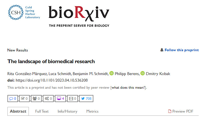 近期,预印本服务器 bioRxiv上报道了一项利用人工智能对医学文献进行的可视化分析,映射了近2100万篇文献检的关系,其生成的图可以反映很多趋势。 https://www.biorxiv.org/content/10.1101/2023.
