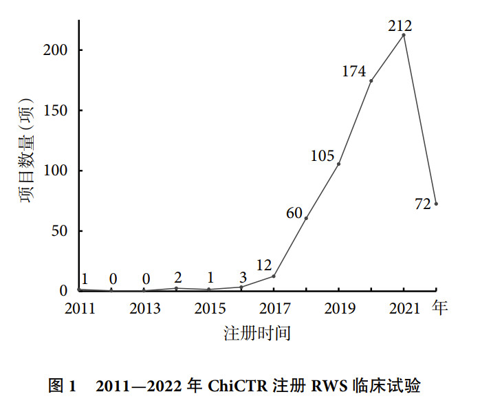 《中国循证医学杂志》2023年1月发表了一篇文献“基于中国临床试验注册中心的真实世界研究现况分析”,截止2022年5月4日,共有642项真实世界研究注册项目。从2015年开始,RWS注册项目数量逐年递增,2021年达到212 项,2022年