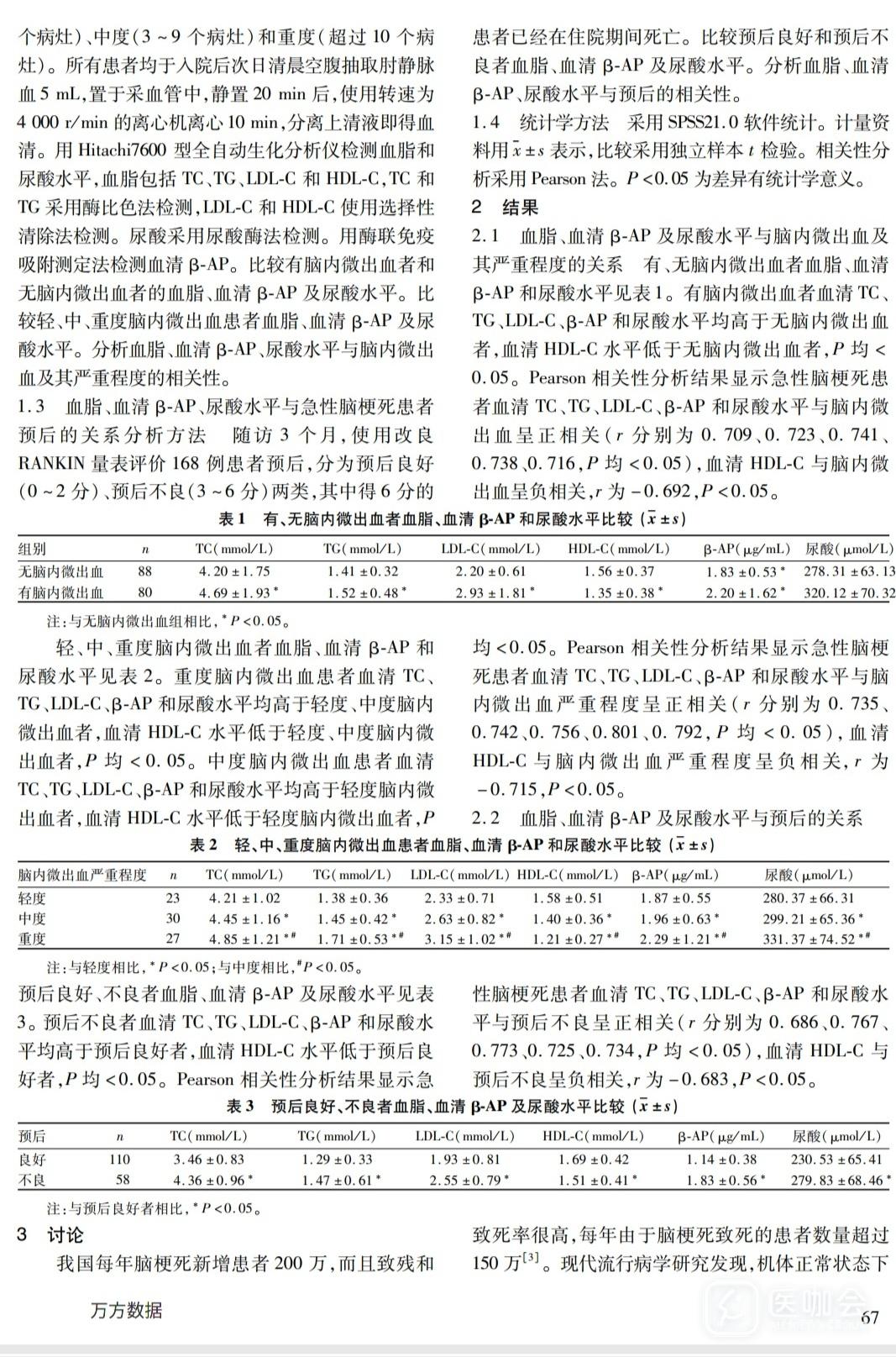 这篇文章中,病情严重程度按照出血灶的数目划分为轻中重,预后以评分划分为两个层次,那这篇文章中血脂尿酸与病情严重程度和预后的相关性,是不是要用spearman相关。那怎么修改才能使用。pearson相关呢。