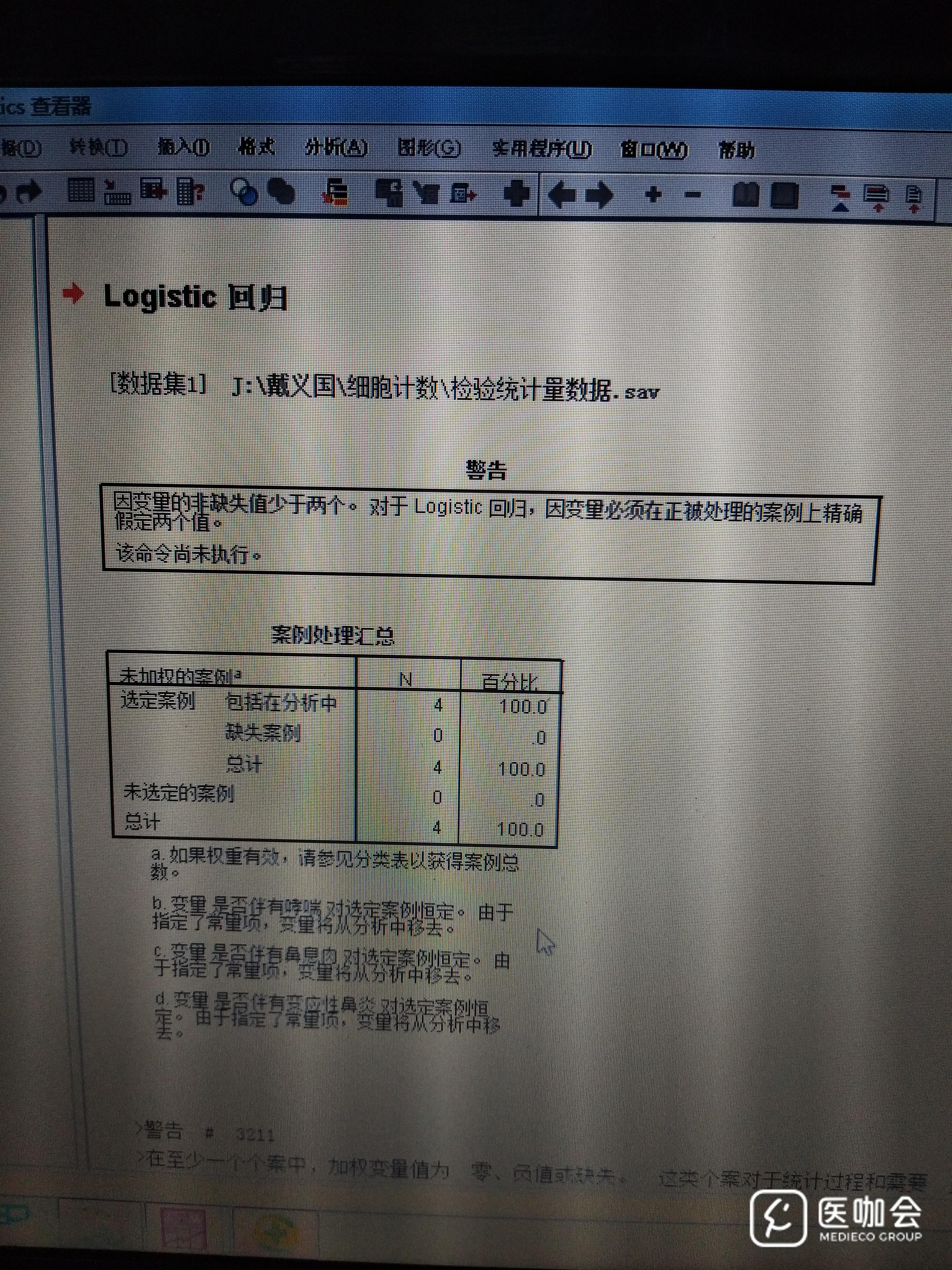 我在做二元Logistic回归分析时spss提示我因变量的非缺失值少于两个,这是