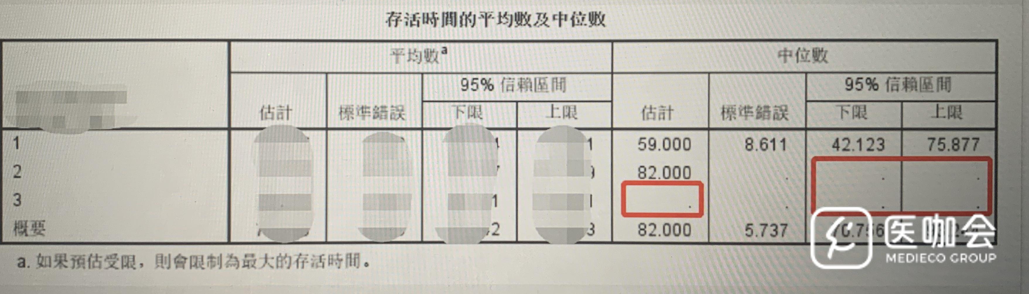 使用SPSS软件进行生存分析,采用KM法绘制生存曲线,中位时间如图,请问中位数未显示,或是有中位数但没有95%置信区间(图中红色方框处)是什么原因呢?那在描述结果时可以将组3描述为“中位生存未达到”吗?谢谢!