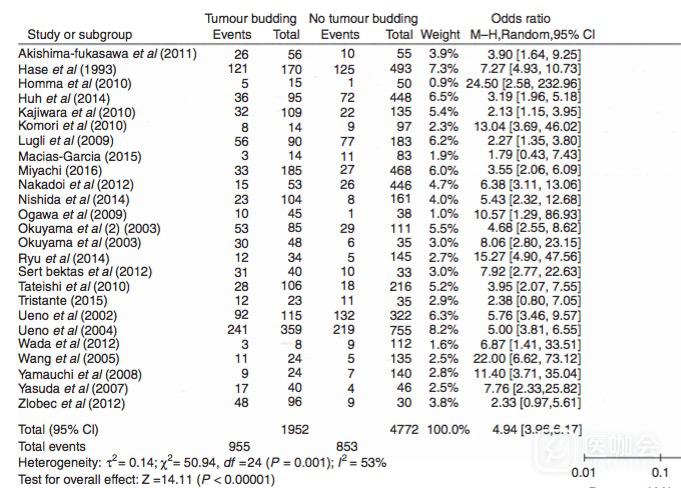 本人meta小白,想请问一下,要研究tumour budding和结直肠癌的风险关系。以此forest plot为例。在cohort studies中提取event和population number。event number是否为955+853?population number是否为1952+4772?谢谢大家!