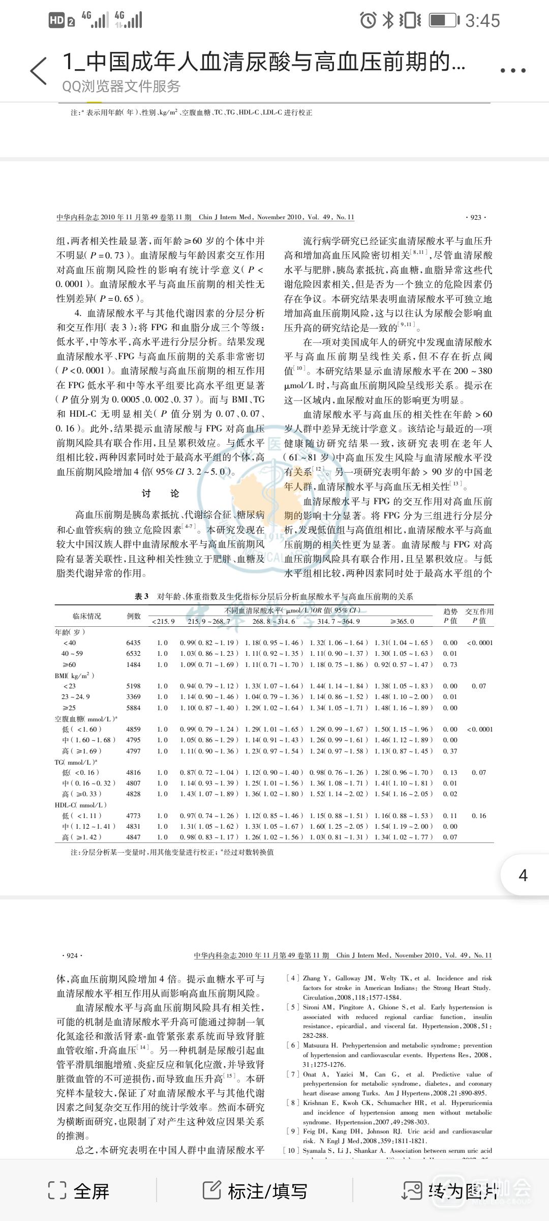 我对表3中交互作用的p值有个疑问:是把年龄、BMI等这些当计量资料和不同血清尿酸水平分析出有交互作用,再对这些计量资料进行分层求出趋势P值。还是直接把年龄、BMI分层后当等级资料和尿酸进行logistic回归交互分析得到交互p值?