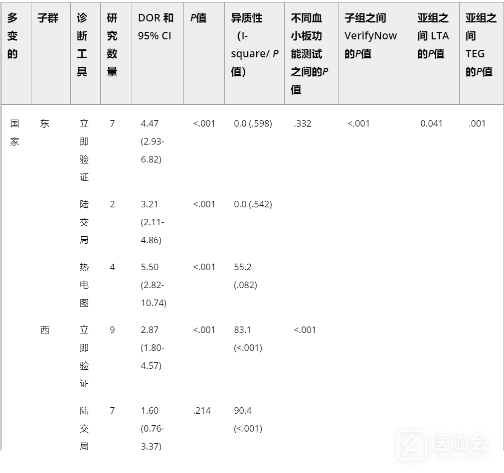 下图这个表格中亚组之间VerifyNow.LTA.TEG的P值是如何计算出来的,我用stata对数据进行亚组分析,前面的都计算出来了。这个不知道用什么方法。