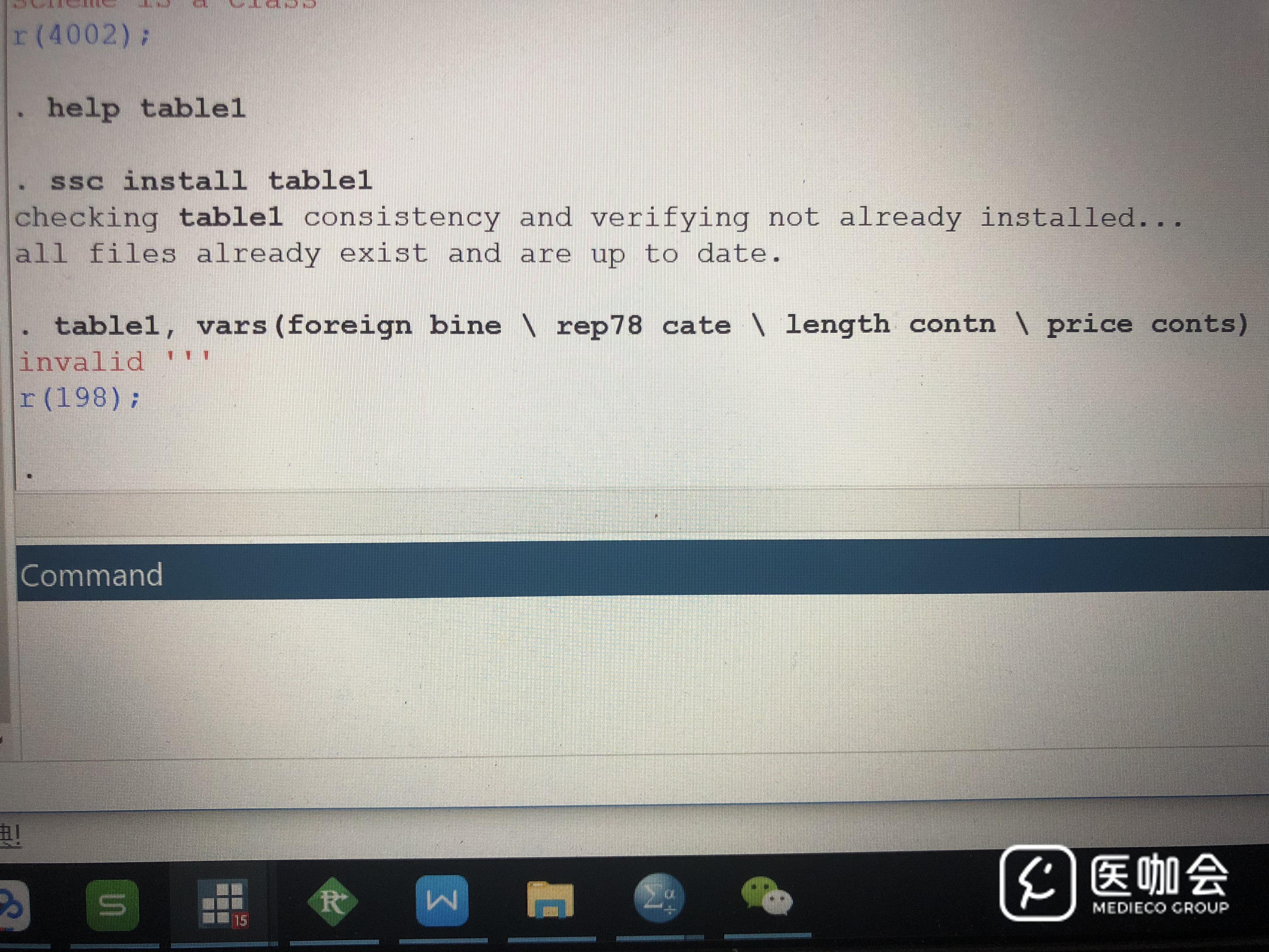 为什么我按照步骤执行到 table1, vars(foreign bine \ rep78 cate \ length contn \ price conts)语句,总是提示invalid ''' r(198);。