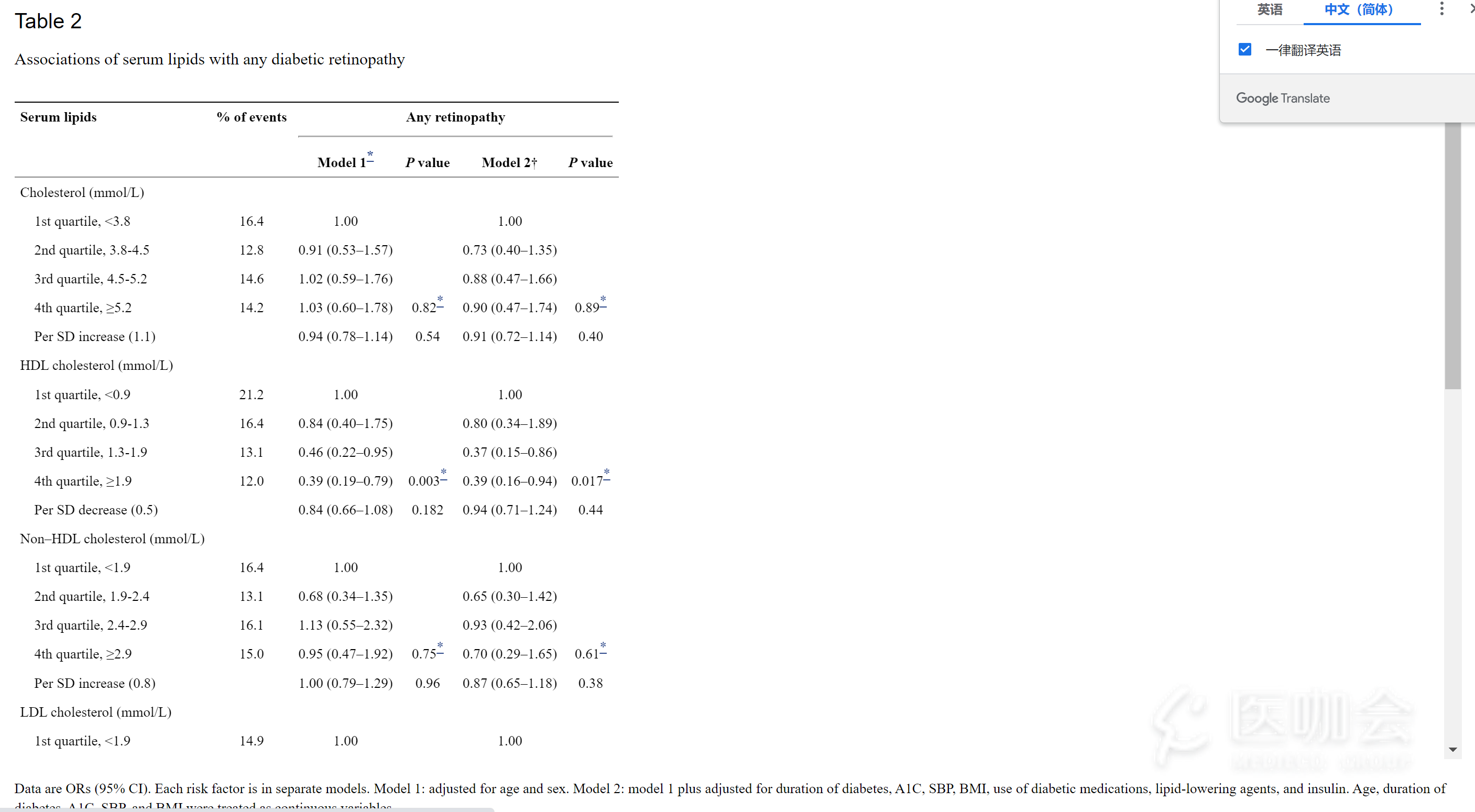 表 2显示血脂、载脂蛋白和糖尿病视网膜病变之间的关联。