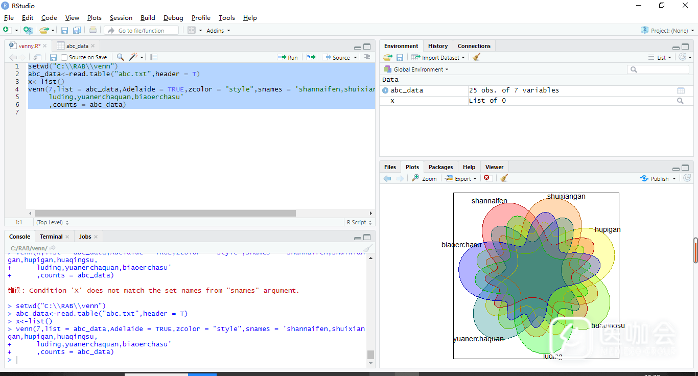 你好 我是用 R语言的 Venn包 做 七元素韦恩图的 但是 我就是 不知道 怎么 导入到我那个 代码里面 我给你发一张图 能不能帮我 看一下 我到底漏了那些 代码 网上 是在 找不到 谢谢