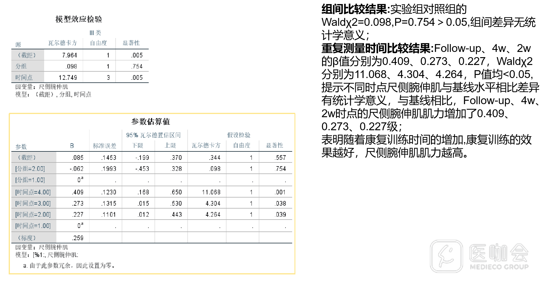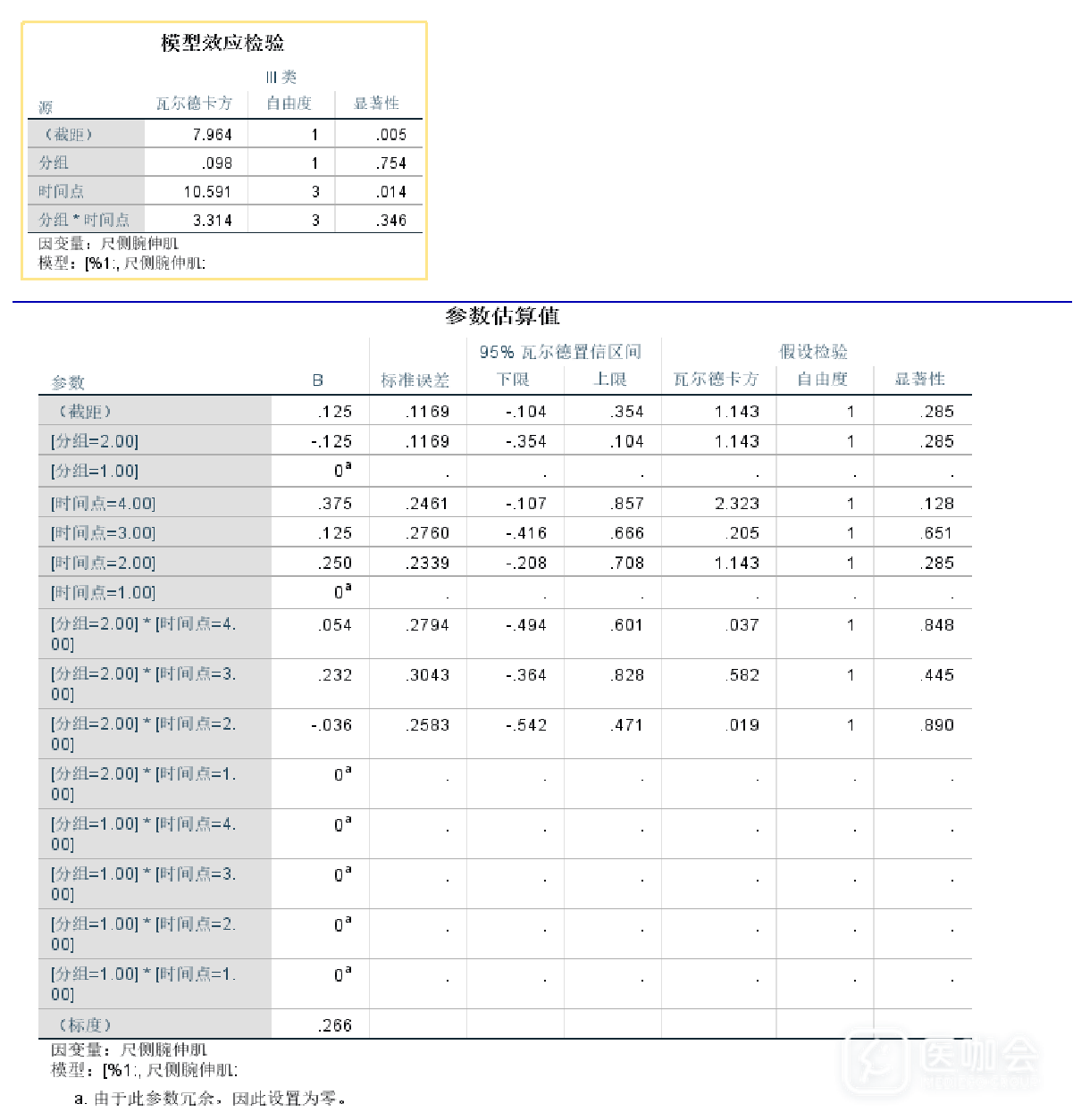 老师您好!我利用广义估计方程的方法比较2组患者(实验组和对照组),在不同时点(基线、治疗后2周,4周,随访)的治疗效果的比较。自变量是不同时点和组别,因变量是连续变量(下图以尺侧腕伸肌为例)。下图是我在SPSS里做出来的过程图,我用SPSS做的有或者无时间和组别的交互时,做出来的结果图不同,如下图(图1、图2)。