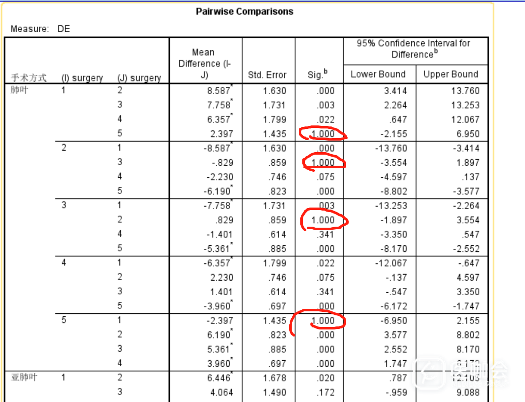 spss输出结果中,很多项两两比较的p值等于1,p可以等于1吗?这是统计做错了吗?