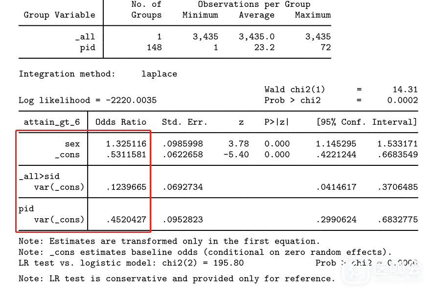 随机效应logit模型中,输出报表的变量随机系数怎么分析,var(cons)值是什么意思
