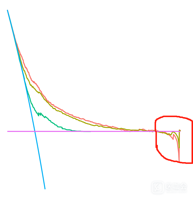 还请各位老师指教,为什么会有一部分曲线在阴性结果下面,这张图可以说明红色部分优于淡绿色部分吗