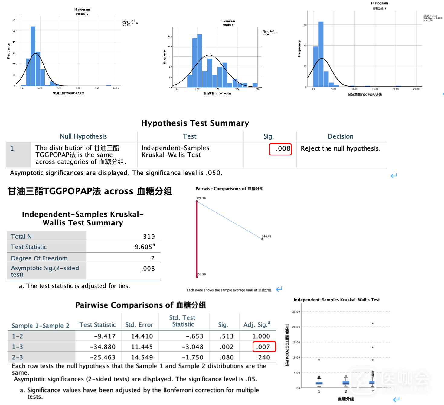 以血糖分为3组,对比其甘油三酯水平(非正态)是否有差异,采用非参数检验,检验结果示差异显著。两两对比后,发现①组1和组2差异不显著;②组2和组3差异不显著;③仅组1和组3差异显著。