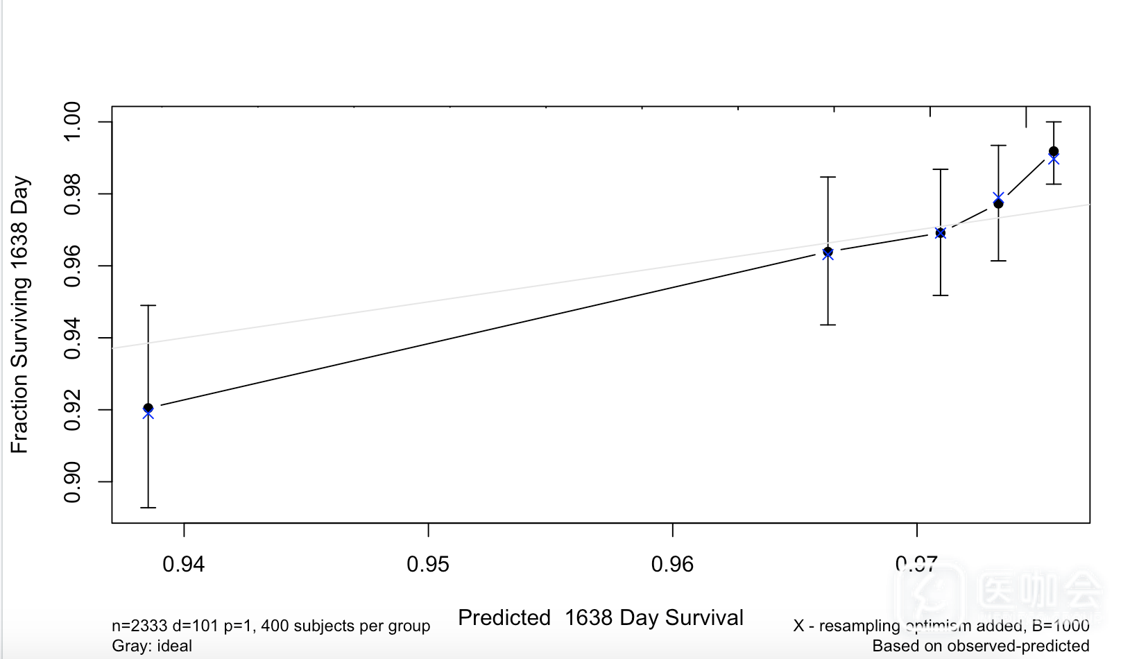 得到了一张校准曲线图,横纵坐标是预测生存概率和实际生存概率