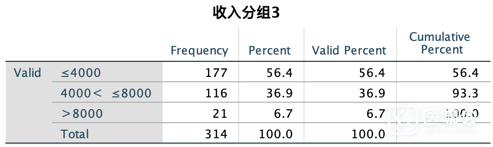 2)思路二:为体现实际收入差异带来的因变量变化,凭个人感觉选择4000/8000进行了分组,见“收入分组2/3”,个人认为,这样可能更能体现收入差异带来的影响(收入变化4000元),但问题是各组人数差异较大,担心是否会影响回归分析的结果?
