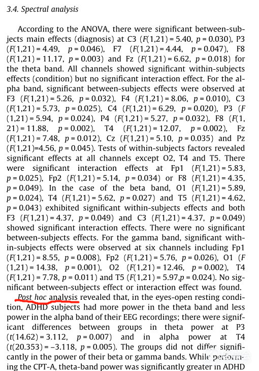 个人理解post hoc即两两比较的意思,用于ANOVA比较两组有差异后再两两比较具体是哪个水平存在差异。但是这篇文章中(截图所示开头)开始已经说明了各个区域之间(C3,F7…)分别的差异,怎么划红线的地方又出现了新的“事后分析”呢?而且得出的数值和上文不同。 想知道文献这个地方的统计思路。是否是我理解的post hoc是不对的?