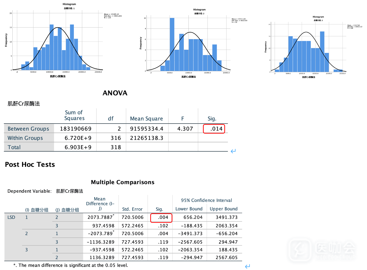 以血糖分3组,对比其肌酐水平是否有差异,肌酐为正态分布,故采用方差分析,结果如下: