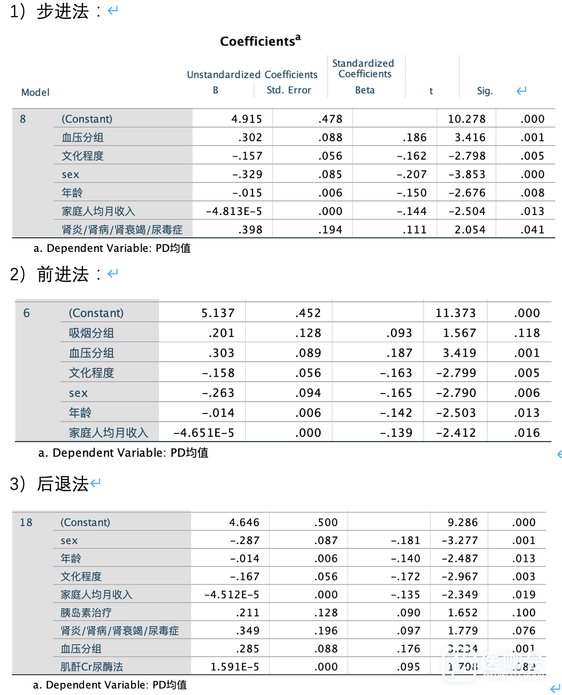 利用现有数据进行多重线性回归分析,应用步进/前进/后退法,三种方法最终纳入的变量不一样,该如何选择呢?Thx