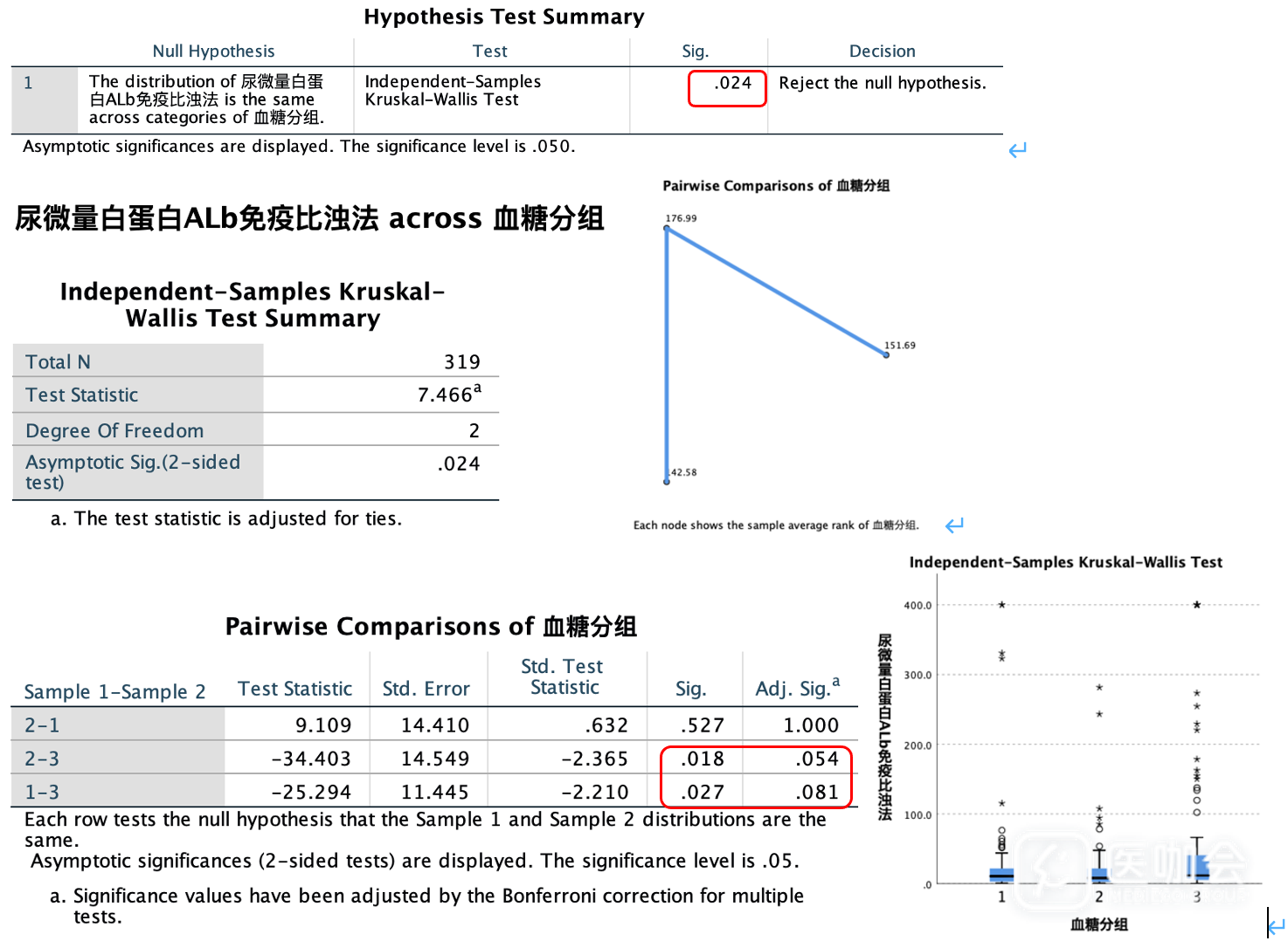 根据血糖分为3组,对比其尿微量白蛋白(非正态)是否有差异,采用非参数检验