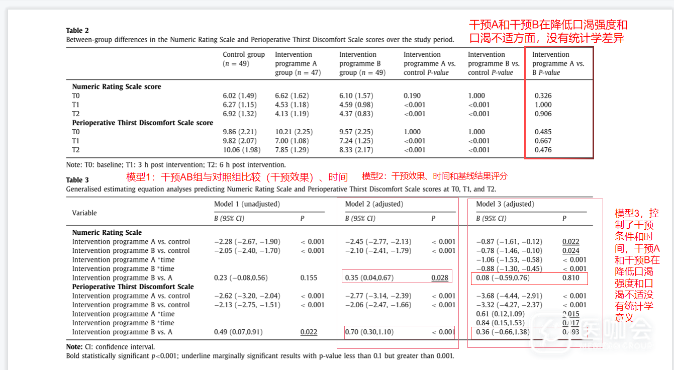 表二是3个组在口渴强度和口渴不适之间的组间差异。干预A和干预B在降低口渴强度和口渴不适方面p大于0.05没有统计学差异。