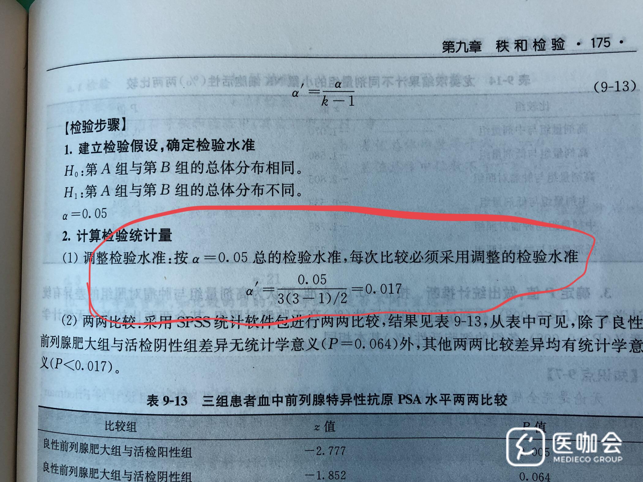 用spss做k-w检验3组两两比较,有一组得出P值为0.031,这个P值是跟0.05的检验水准比,还是跟按照书上写的调整后的检验水准a’比较