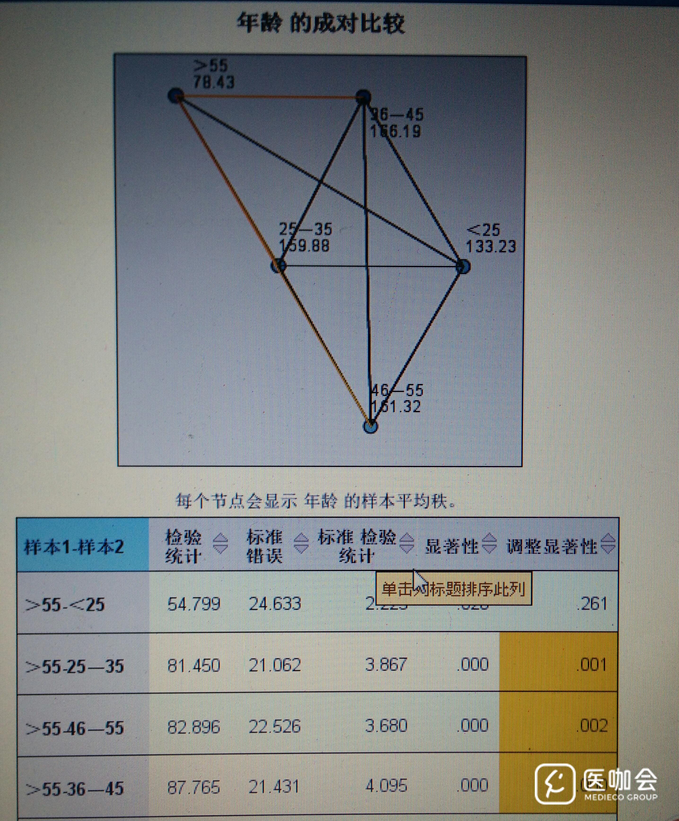 您好,我想咨询关于非参数检验多重比较的结果解释问题*。如图二所示的成对比较结果,里面的检验统计和标准检验统计代表什么意思?其正负对结果解释有无影响?如>55-25—35,>55的平均秩和中位数均小于25—35组,那对结果是否可以解释为>55组在该维度的得分显著低于25—35组吗?但此处检验统计值为正值,对结果解释有无影响?其与方差分析事后检验的平均差异的表达含义是否相同?若相同则与数据结果呈现相反关系,若不同,其是什么含义?迫切需要得到您的回答,万分感激!