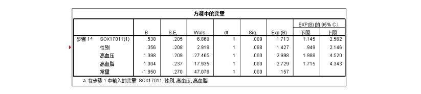 老师,您好,我最近在进行一项基因多态性的病例对照研究,研究中病例组和对照组均基因R有GG、GA、AA三种基因型,经过卡方检验后两组间基因型分布差异有统计学意义(p<0.05),一般临床资料中性别、高血压、高血脂通过单因素分析在两组间差异也有统计学意义,故想对两组间基因型分布进行多因素二元logistic回归分析,看在校正性别、高血压等因素后两组基因型分布是否具有统计学意义,选用二分类Logistic回归分析,在方程中将基因型GG定义为0,得出结果中SOX17(1)、SOX17(2)那行的P值如果大于0.05(图一),然后将基因型GG定义为哑变量0,GA+AA定义为1,在将性别、高血压、高血脂纳入回归分析中,结果提示SOX17(1)那行的P<0.05(图二),是否就是说明两组间基因型差异有统计学意义。我是否还需将其他变量在定义为哑变量再进行计算。