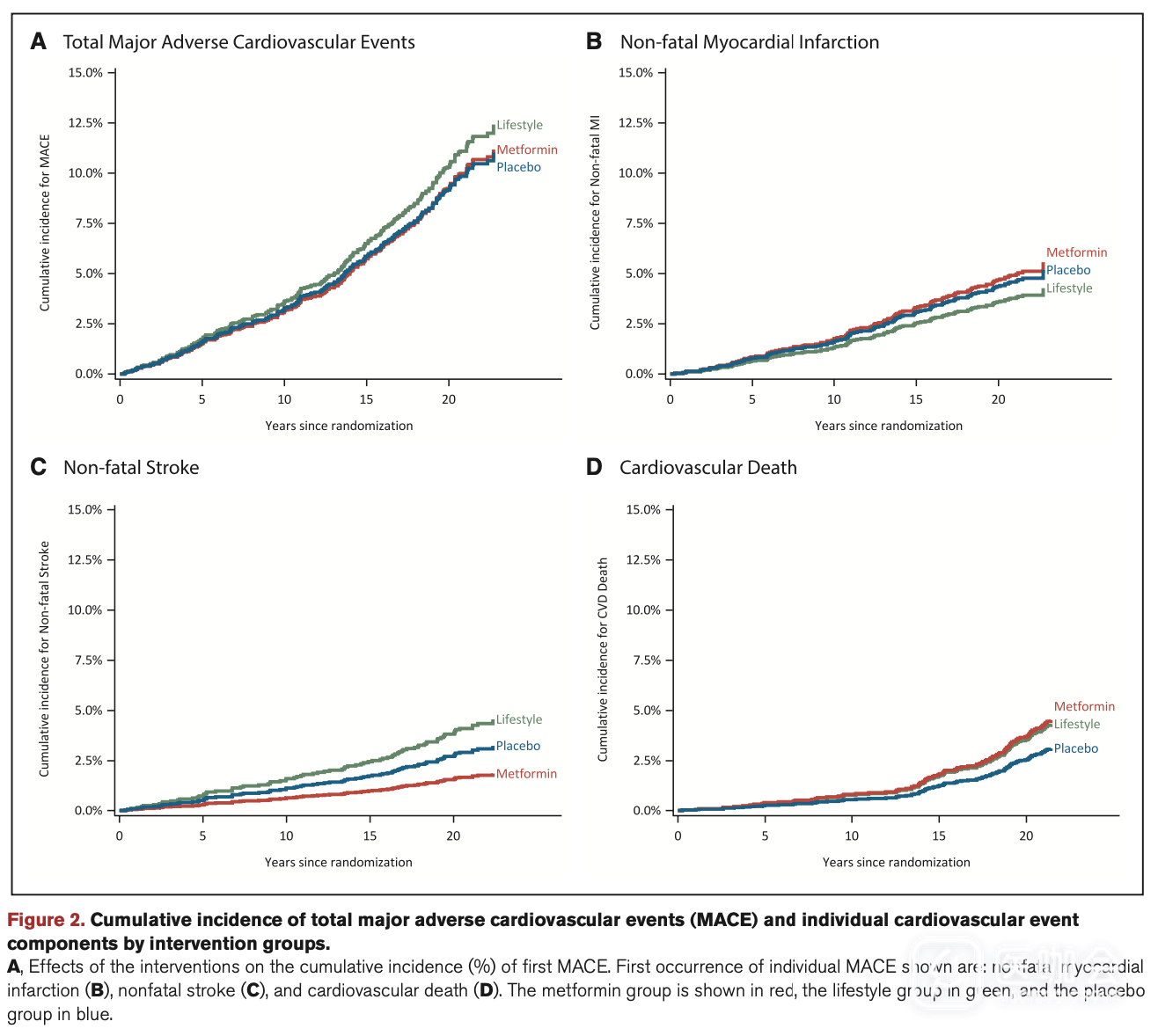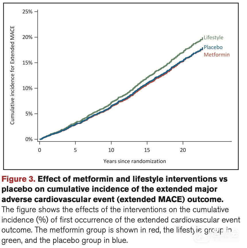 在21年的中位随访期间,有310人首次发生主要心血管事件。几个治疗组间的心血管事件发生率没有差异:与安慰剂组相比,二甲双胍组的HR为1.03(95%CI,0.78-1.37;P=0.81),生活方式干预组的HR为1.14(95%CI,0.87- 1.50;P=0.34)。