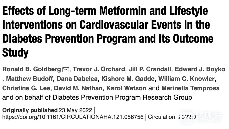 2022年5月23日,心血管领域顶尖学术期刊《Circulation》(IF=29.69)刊登了一篇文章,DPP研究(糖尿病预防计划)和DPPOS(糖尿病预防计划结局研究)参与者的中位21年随访的结果显示,二甲双胍和生活方式干预都没有减少主要心血管事件的发生。