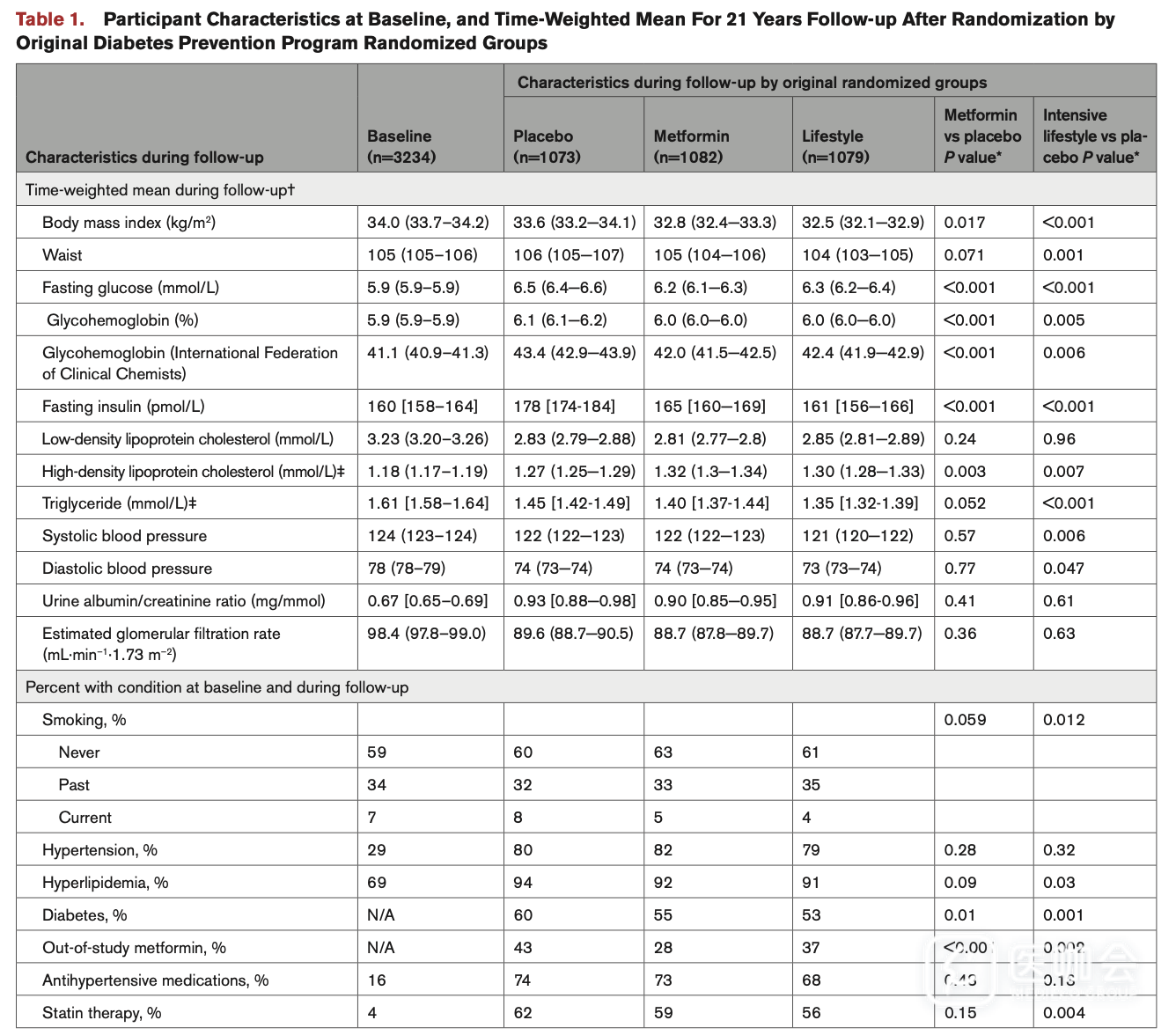 在DPP研究期间(1996-2002年),3234名糖耐量受损的参与者被随机分配到二甲双胍(850mg,每天两次)组,强化生活方式组或安慰剂组,随访3年。随后18年(2002-2019),所有参与者参与DPPOS研究,生活方式干预组的干预强度变低,二甲双胍组继续使用二甲双胍。