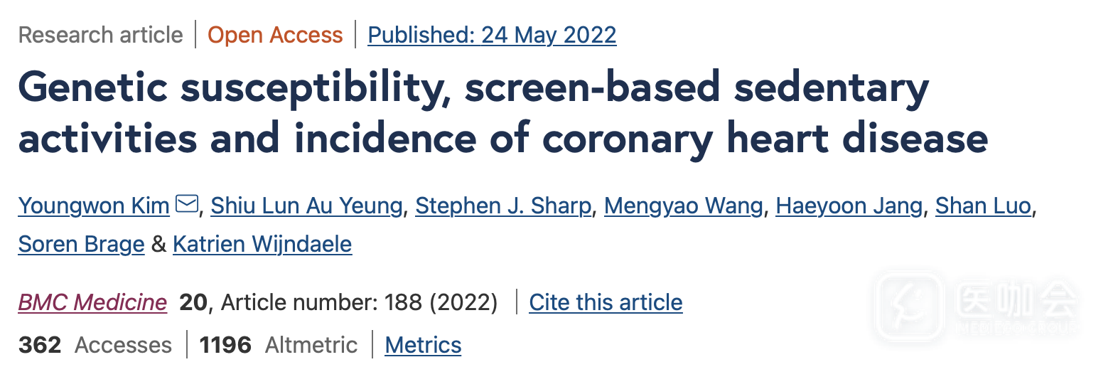 2022年5月24日,《BMC Medicine》(IF=8.775)刊登了一项研究,分析了看电视时间和玩电脑时间与冠心病发病率的相关性。研究结果表明,不论冠心病遗传风险高低,与每天看电视不超过1小时相比,看电视超过4小时/天,冠心病风险显著增加。