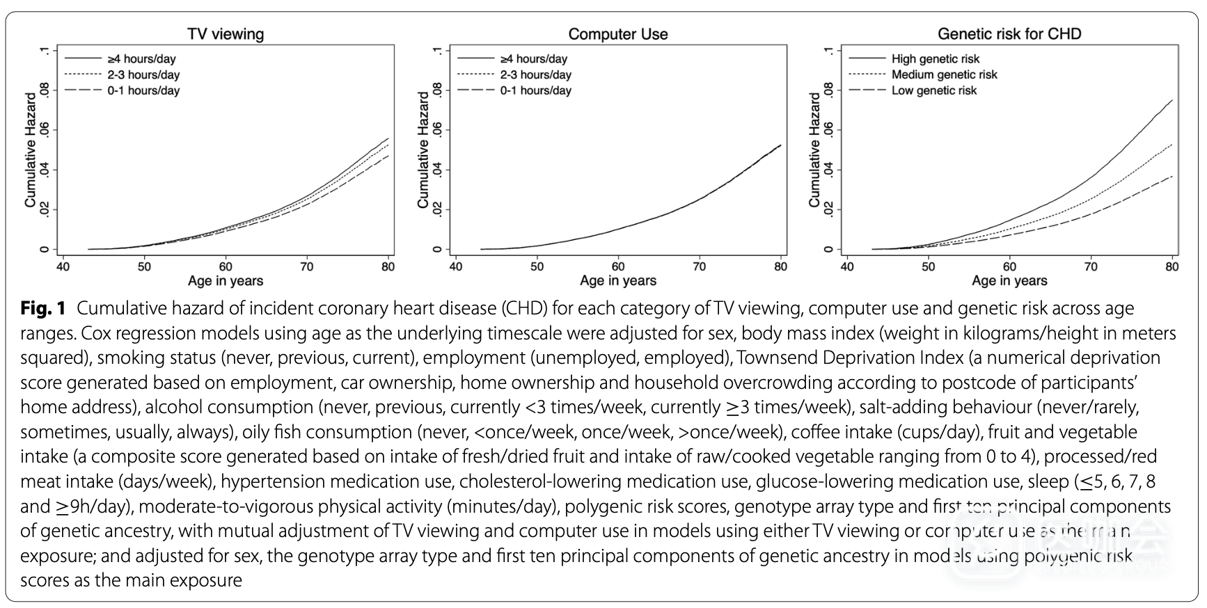 调整了包括冠心病遗传风险在内的潜在混杂因素后,结果显示,与每天看电视时间≥4小时的参与者相比,每天看电视≤1小时和2-3小时与冠心病发病风险更低存在相关性,HR分别为0.84(95%CI 0.79-0.90)和0.94(95%CI 0.90-0.99)。未发现玩电脑和冠心病发病率之间存在相关性。敏感性分析的结果与这些发现相似。
