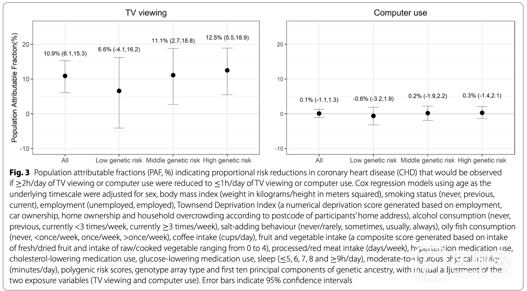 假定存在因果关系的情况下,如果看电视的时间从≥2小时/天减少到≤1小时/天,可以避免10.9%(95%CI 6.1-15.3%)的冠心病发生。