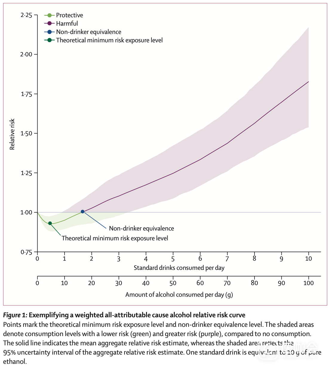 分析发现,不论所在地区、年龄、性别或年份,理论最小风险的饮酒量(TMREL)都很低,为每天0~1.87标准杯(1个标准杯相当于有10g 纯乙醇,约为375 mL度数为3.5度的啤酒)。