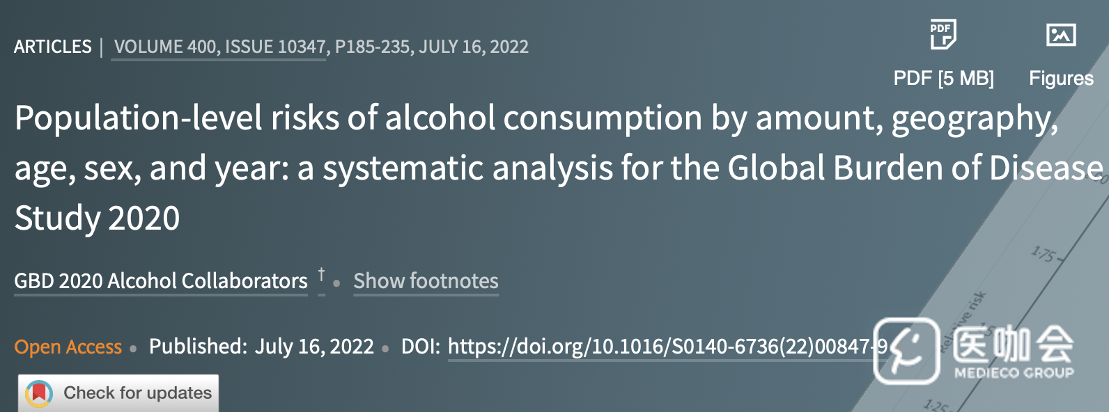 2022年7月16日,《Lancet》(IF=202.371)刊登了一项研究,使用全球疾病负担研究(GBD 2019)的数据,分析了不同人群的饮酒相关健康风险,结果表明,不同年龄人群的饮酒相关健康风险不一样,支持基于年龄作出不同的饮酒建议,但无明显性别差异,无需针对不同性别作出饮酒推荐。